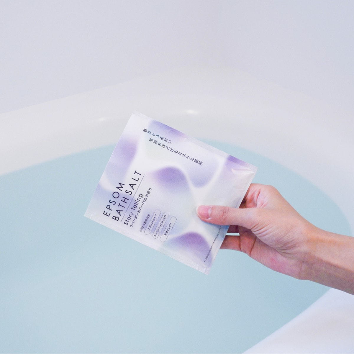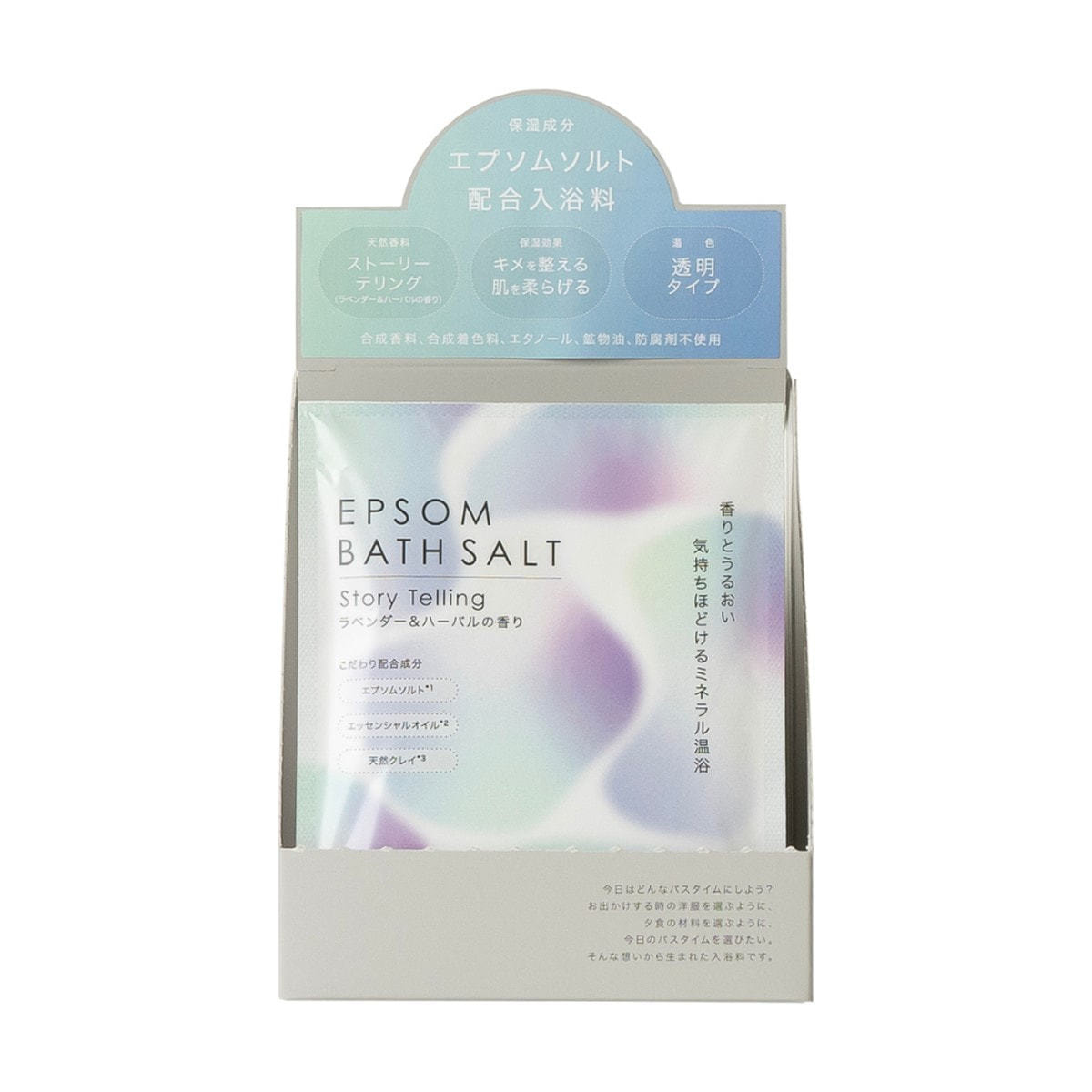 エプソムソルト(硫酸Mg(保湿成分))をメインに、エッセンシャルオイル(天然芳香成分)、天然クレイ(ベントナイト(吸着成分))を合わせました。